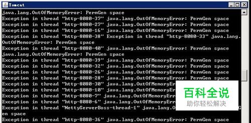 怎么知道tomcat服务器内存溢出了呢?看一下cmd命令行显示的内容就知道了,java.lang.OutOfMemoryError: PermGen space就是内存溢出