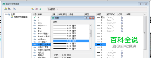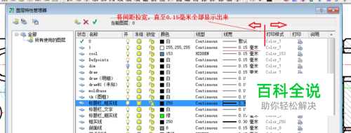 将线宽一栏拉宽,直至0.15毫米显示完全,具体操作如图所示