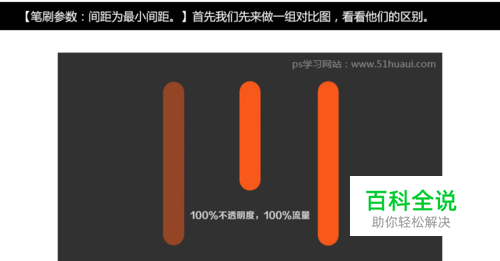 笔刷参数:间距为最小间距。 中间是100%不透明度和100%流量,左边是流量不变,不透明度50%, 右边是不透明度不变,流量50%。 总结一下:不透明度不变而流量50%时,和100%的不透明度和100%的流量效果完全一样。