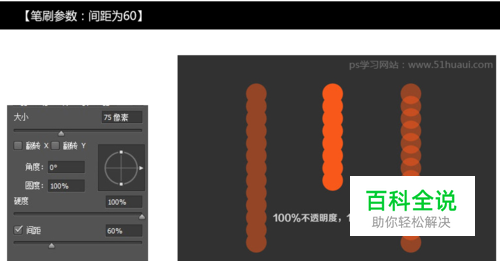 笔刷参数:间距为60。 不透明度不变而流量减半这种情况下,出现了颜色叠加的现象。