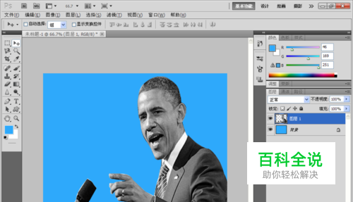 将用钢笔工具选中的人物图像,按crl+J快捷键提取出图层,选择图像颜色模式为灰度模式,其余的背景图层被锁定,将背景颜色调整为深蓝色。如图。