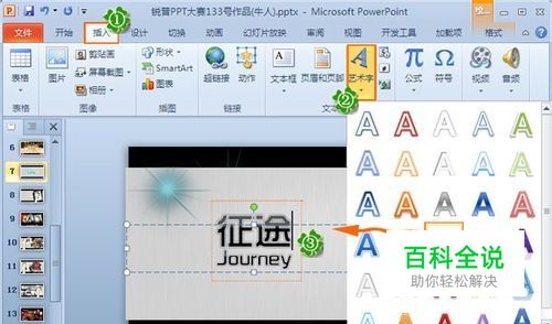 这PPT文件主要是由大量的图片(png、jpg)素材,文字,动画特效和其它元素,通过巧妙的应用和恰当的色彩搭配而做出来的。ppt动画制作视频的教程,下面将说说几个知识点。首先常用的插入文字,要想好看些,可以选择“插入”--“艺术字”,下拉菜单中就有很多的样式可选。