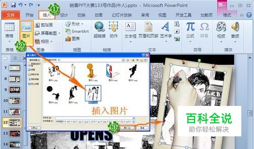 图片的插入。选中某幻灯片,然后选择“插入”-“图片”,打开文件夹中双击图片导入。这里用了很多的PNG图片,它有一好处,背景可为透明的免抠图,这能很自然地溶入幻灯片上。