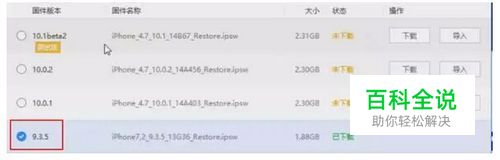 然后找到此软件下的“刷机越狱”选项,这里有四个固件版本选项,分别是 iOS 10.1测试版本、iOS 10.0.1、iOS 10.0.2、iOS 9.3.5,我们需要的就是iOS 9.3.5版本,我们将这个固件版本下载下来。