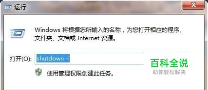 第一步:打开“开始”,单击“运行”,在运行里输入下面的代码“shutdown -i”(字母+空格+i),如图。