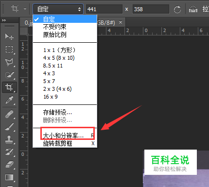 选择裁剪工具,在上面的设置里点击自定义选项,在其内找到大小和分辨率选项,如图所示: