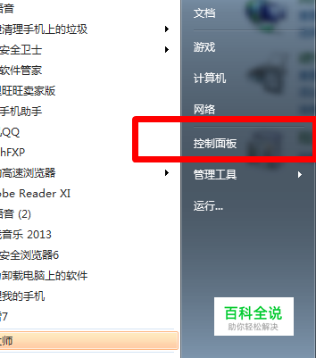 首先我们打开电脑的“开始”菜单,选择“控制面板”。