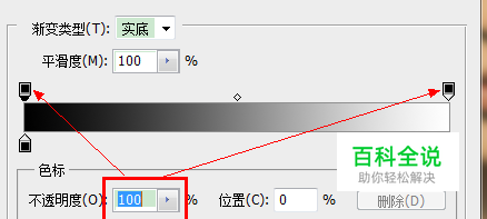 左上角和右上角的色标是用来调整渐变不透明度的,用鼠标单击这两个色标就可以在下方调整渐变的不透明度,如图: