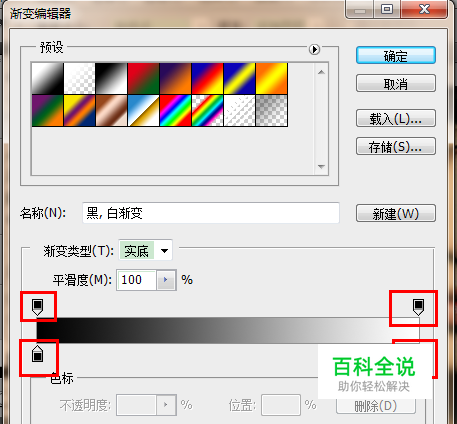 左下角和右下角的色标是用来调整渐变颜色的,用鼠标单击这两个色标就可以在下方调整渐变的颜色,如图: