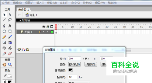 启动flash程序以后,打开属性面板设置一下舞台属性,长和宽都设为200像素,背景为黑色,体现夜晚的景象。