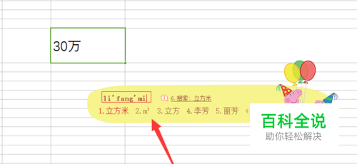 其实最简单的办法就是使用 输入法直接输入需要插入的单位符号,如图所示,后边会出现一个备选的m³,然后点击一下就可以输入到单元格了。
