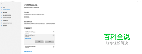 进入Windows Defender安全中心——病毒和威胁防护——威胁历史记录——检查出的威胁——选中下拉菜单中多出还原选项。
