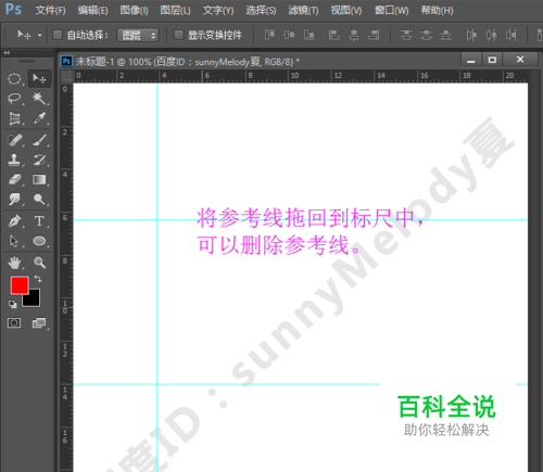 如果我们不需要参考线,可以将参考线拖到标尺中,或者将参考线拖出画布就可以删除参考线了。