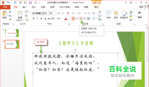 一、设置PPT文本对齐方式 如下图,选中文本框,点击”开始“选项卡组中的”左对齐“按钮,若点击”右对齐“按钮,则文本框中文字向右对齐。