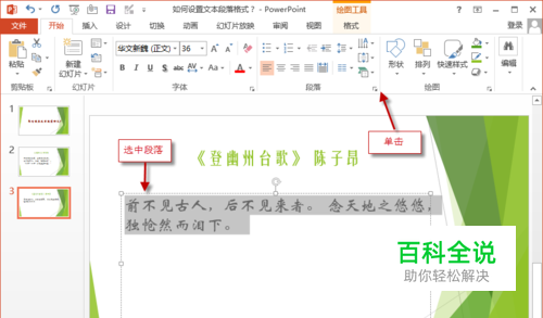 五、设置PPT文本方向 如下图,先选中文本段落,在”段落“组中单击“文字方向”图标,在下拉菜单中选择“竖排”,文字排为竖排方向。
