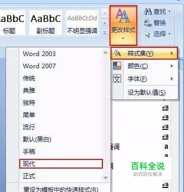 单击【开始】选项卡【样式】组的【更改样式】按钮【样式集】【现代】。