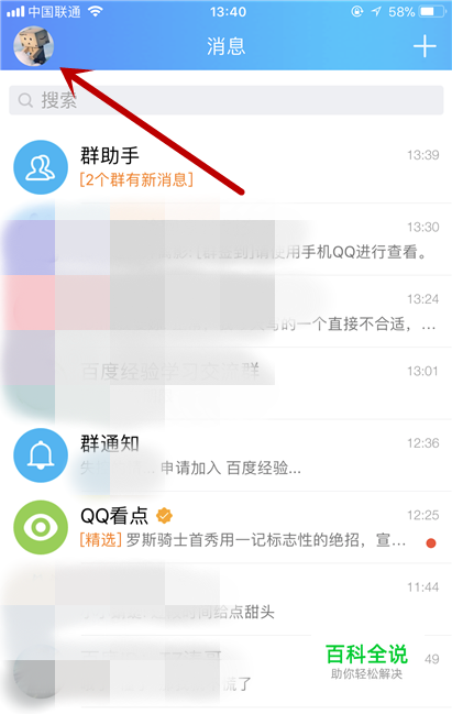 打开你的手机QQ,进入主界面之后,点击一下左上角的头像以进入到你的界面。