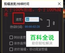 4、更改“速度”数值为50%或其他(大于100%加速,小于100%减速) 注:若想不同时放慢音频文件,可在更改速度前选中视频,右击鼠标,选择“取消链接”即可