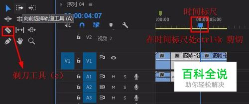 2、选中视频,利用“剃刀工具(C)”或快捷方式 ctrl+k 对要放慢的部分进行裁切