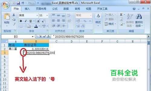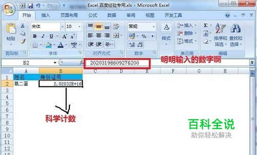 首先我们再单元格输入葛二蛋的身份证号20203198609276200,输入后,excel自动以科学计数显示。