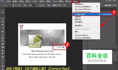 点击【帮助】 - 【关于增效工具】 - 【Camera Raw】,在弹窗中可以看到PS里自带的Camera RAW 7.3的版本,版本过旧,打不开近几年新出的单反相机照片格式,所以我们要升级成比较新的版本。