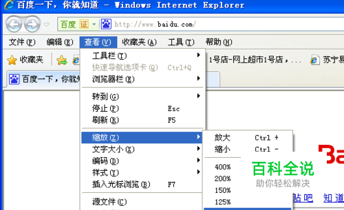 IE浏览器,点击浏览器上面工具栏里【查看】——【缩放】——【100%】,这样就可以恢复浏览器上文字大小了。