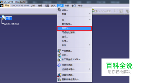 打开Catia,然后选择菜单命令“工具”——“自定义…”;