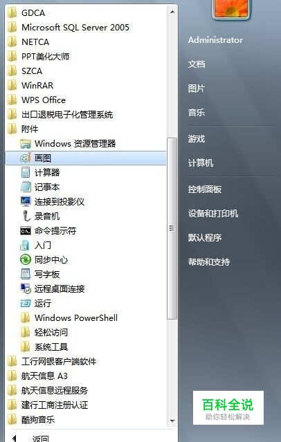 选中“开始”,打开应用程序里下一级目录里的附件,选择附件里的画图软件