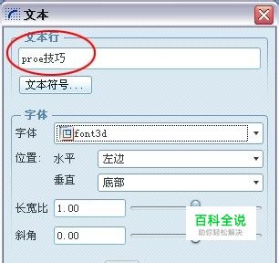在文本行下面输入文字“proe技巧”,字体采用“font3D”如图