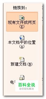 对话框左侧共有4项可选,分别是“现有文件或网页”,“文档中的位置”,“新建文档”,“电子邮件地址”。我们最常用的前两项。