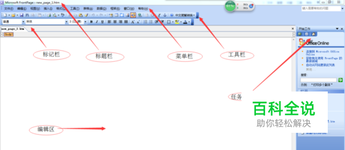 打开软件 启动FrontPage 2003,打开FrontPage窗口,如图。 标记栏:当我们选择了网页中的某个对象时,该栏会自动显示这个对象相关的HTML标记。 任务窗格:将多种命令集成在这个统一的窗格中,方便操作。