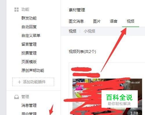 步骤一:登录微信公众号,点击左侧栏中的素材管理,再点击上面的视频。