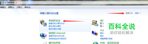 (2)鼠标左键键单击进入“控制面板”界面,右上角“查看方式”选择“类别”,然后点击“系统和安全”。