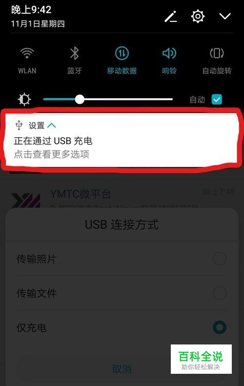 将待充电设备通过数据线和mate20连接。在mate20会显示界面设置,点击设置