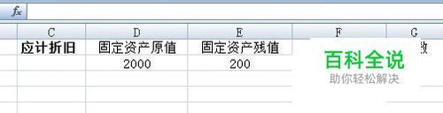 一、数据准备。如图所示,固定资产余额法主要需要三个数据,分别是固定资产原值、固定资产残值及折旧期数,本例中分别为2000、200、5。