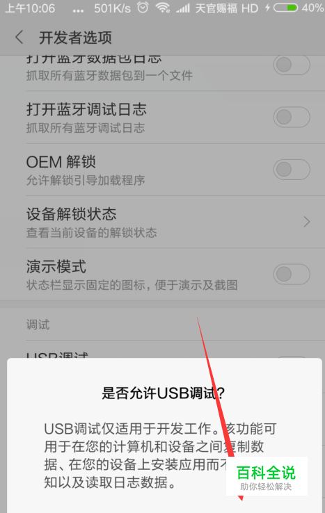 在开发者选项的下边开启USB调试功能,然后使用数据线连接电脑的时候弹出来一个菜单点击开启也可以。