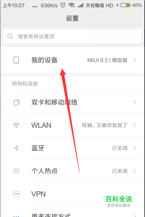 小米手机在桌面找到设置菜单,然后点击上方的 我的设备,如图所示。