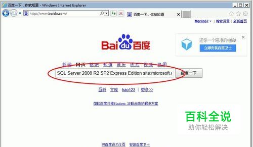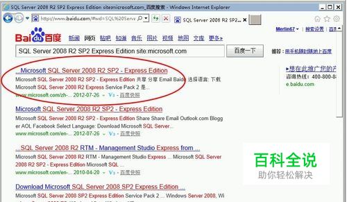 打开浏览器; 在搜索引擎输入“ SQL Server 2008 R2 SP2 Express Edition site:microsoft.com”, 在微软网站搜索SQL Server 2008 R2 SP2免费版;