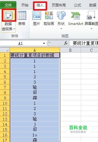 这里给大家介绍一下,用excel的数据透视表来快速统计一列数据中项目的重复次数。