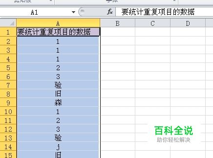 这里,我举一个例子,目的是要统计出单元格区域A2:A17中所有项目的重复次数。 注意:单元格A1为这一列数据的列名,用数据透视表来统计项目的重复次数,列名是必不可少的。没有列名的,请在这一列数据前添加一个列名,列名具体叫什么并不重要。