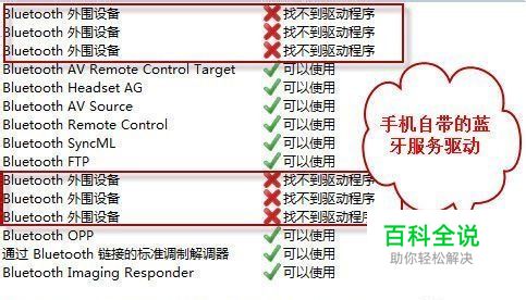当手机和电脑蓝牙配对成功后会弹出一个手机蓝牙服务驱动安装情况的对话框。如下图,但部分手机服务及驱动是系统无法识别的。