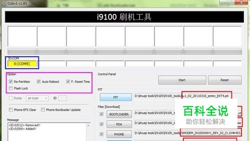 在电脑上操作 运行刷机工具包中的Odin3 v1.85.exe 勾选re-partition、Auto Reboot、F,Reset Time三项; 点击PIT按钮,从刷机工具包中选择u1_02_20110310.....pit; 点击BOOTLOADER从刷机工具包中选择KERNEL.....tar; 点击PDA按钮,从刷机工具包中选择CODE.....tar; 点击PHONE按钮,从刷机工具包中选择MODEM.....tar; 点击CSC按钮,从刷机工具包中选择GT-I9100-CSC.....tar; 将手机连接至电脑,如图蓝色圈选位置变成黄色的才表示电脑连接手机成功,如果没有没变黄请重新插拔USB数据线; 确认手机连接成功后,点击Start,等待完成,出现下图说明刷机成功,手机会自动重启并开机,之后关闭电脑上的Odin刷机工具。