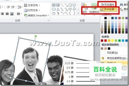 技巧一:为图像添加边框 在PowerPoint中为图像添加边框最简便的方法是绘制自选图形,将填充色设置为无,或透明。同时还可以调整边框的线型、色彩与粗细。还可以为边框添加阴影等效果。我们还可以选绘制图形,然后使用图片填充图形,制作特殊的边框。设置的方法是: