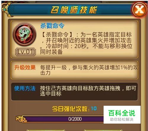 2、召唤师技能强化 召唤师技能开启之后就可以进行强化,根据技能的不同,强化带来的技能提升是不一样,点击强化技能按钮就能打开强化界面,强化后的属性和使用方法一目了然,需要注意的是技能升级需要填满升级经验条,每天只有10次强化机会,每次强化随机增加一定的升级经验,低级需要的经验还是比较少的,比如今天能够开启新的技能,那么留着强化次数,等新技能开启之后再去强化新技能是一个比较好的做法。