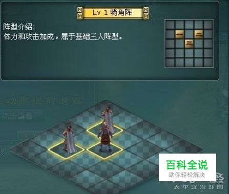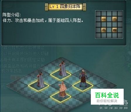 犄角阵:三人成势,成犄角阵。阵位一,阵位二为体力加成,阵列三为加成,为最基础的三人阵。 (图2:四像归本阵)