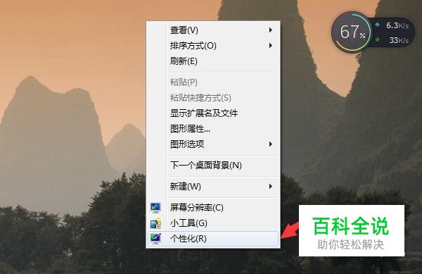 这里以win7系统为例,演示豆沙绿的设置方法。首先,在桌面空白处,右击鼠标,再点击“个性化”。