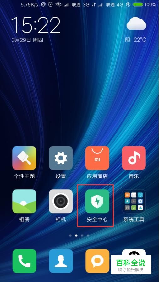 这里以MIUI系统为例,点击MIUI系统桌面上的“安全中心”应用图标,打开安全中心应用主页面。