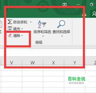 在开始菜单栏下,找到编辑菜单栏。在编辑菜单栏下找到“清除”标签卡。