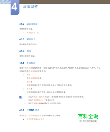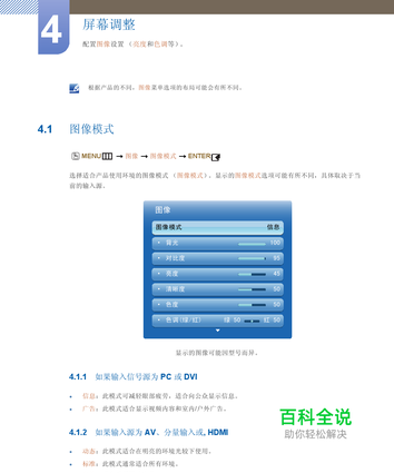 屏幕调整 4.1 图像模式 4.2 背光 4.3 屏幕调整 4.4 自动调整