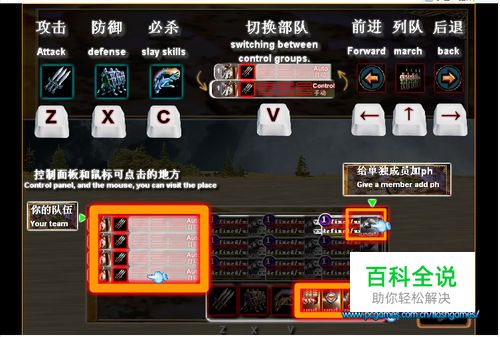 先选择一排队伍,你可以用鼠标选择攻击命令图标或者“z”键来让你的这排队伍攻击冲过来的敌人,用防御命令图标或者“x”键来防御敌人对你的攻击,用技能图标或者“c”键释放技能,用“v”键来切换部队,键盘左键用来后退,键盘右键来进攻,键盘上键可以用来整理队伍。